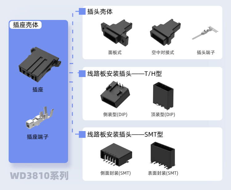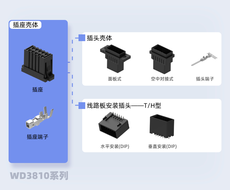 WD3810、WD3811系列是一款線對板、線對線連接器。3.81mm間距緊湊的設計,配合垂直、水平兩種出線方向,適應高密度PCB布局,助力設備小型化。
